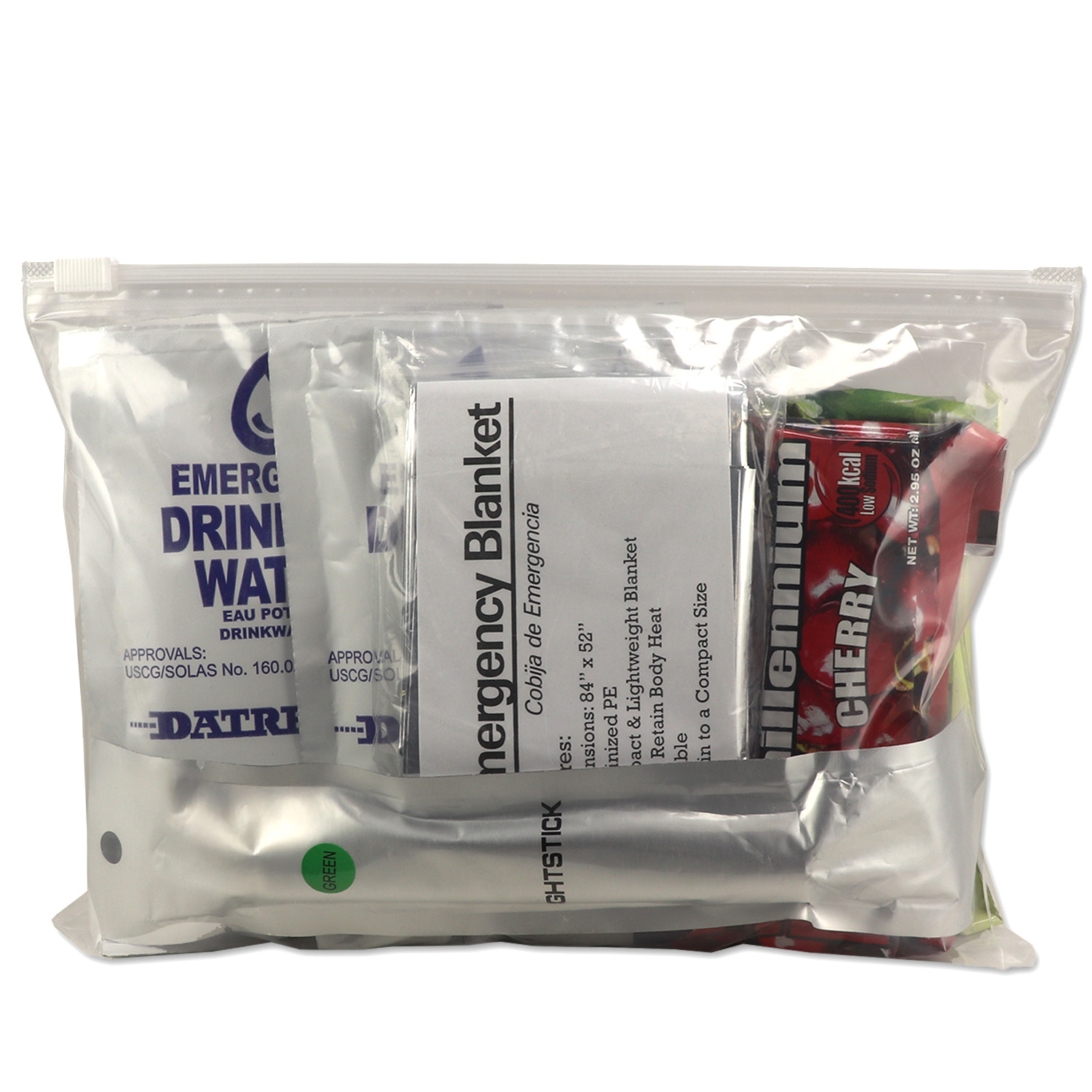 • (3) 400 Calorie Food Bar: Long-lasting emergency food ration with vital nutrients to sustain energy. Each kit contains a blueberry, cherry and vanilla bar.