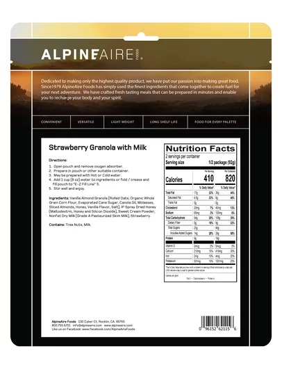 Vanilla Almond Granola with Strawberries & Milk. Just add cold water to bag for a delicious meal. 2 Servings per pouch.