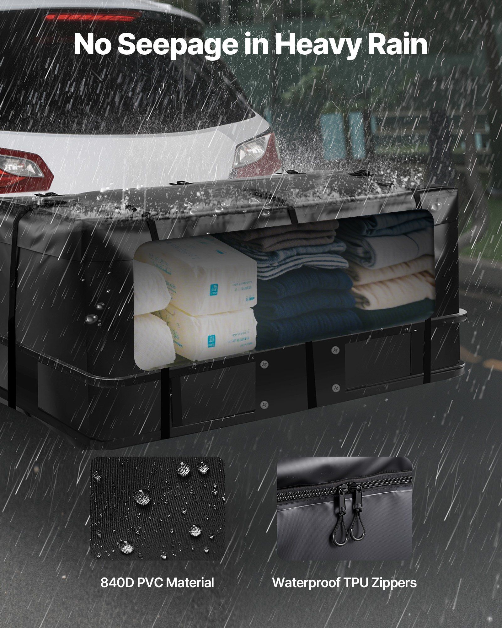 This hitch cargo bag features PVC material and waterproof zippers for double protection, effectively blocking rain and keeping clothes, documents, and sensitive equipment 100% dry and undamaged.